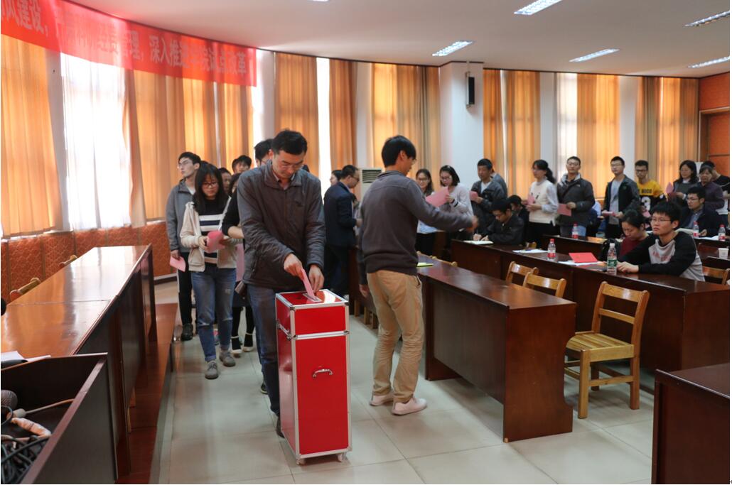 本次会议由地学院党委书记王甫主持。大会第一项,王甫向参会人员报告了到会情况,满足开会人数要求,全体起立,齐唱国歌。第二项,王甫向各位参会党员介绍了学校十二次党代会代表选举的相关要求,以及地学院各支部推选出的十二位党代表候选人预备人选的基本情况。随后各位进行了庄严的投票仪式,各位党员根据自己的选择投下神圣的一票。现场计票后,地学院选出了赖旭龙、王甫、刘勇胜等十位同志作为正式代表参加学校的第十二次党代会。