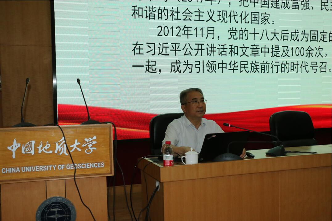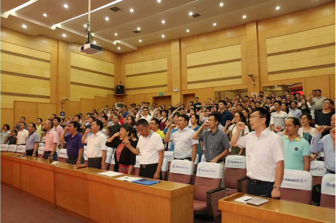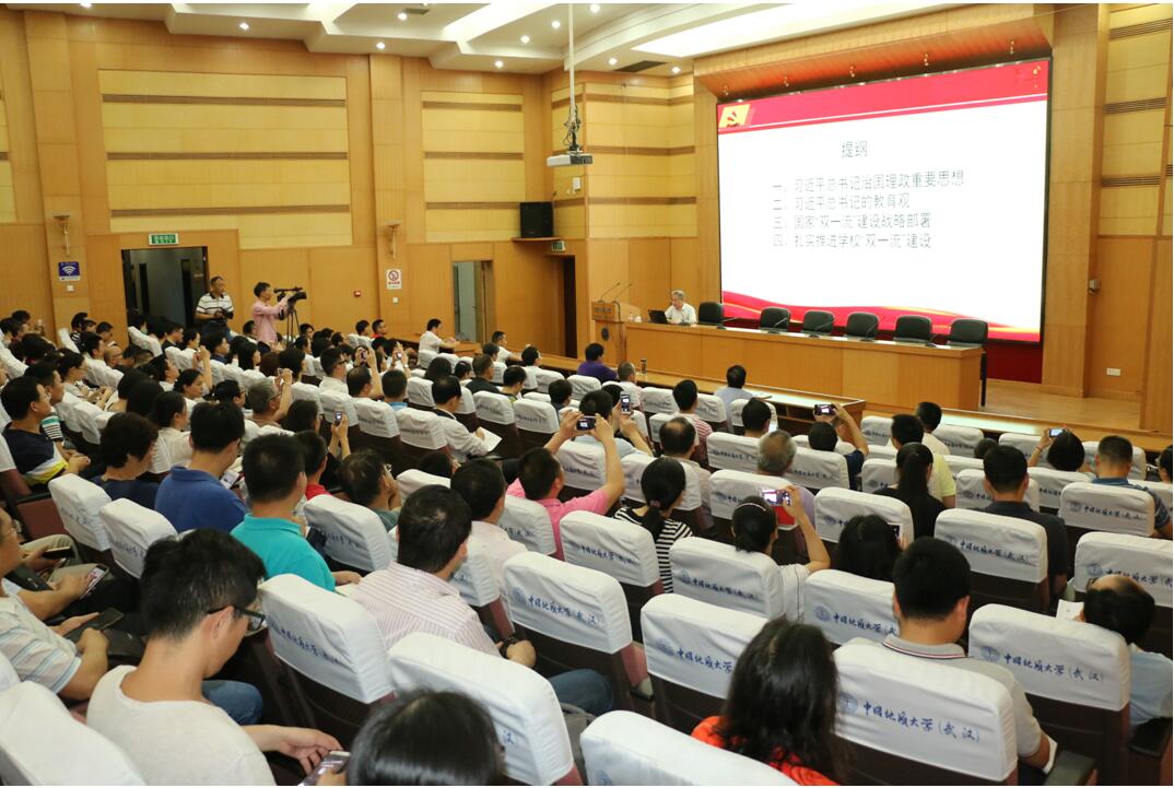 2017年6月20日晚七点,在迎宾楼报告厅,地学院党委组织学院教工党员开展6月份主题党日学习活动,邀请王焰新校长以《深入学习习近平同志治国理政重要思想扎实推进学校“双一流”建设》为题为全院教工党员讲党课。学院党委书记王甫同志主持本次党课。