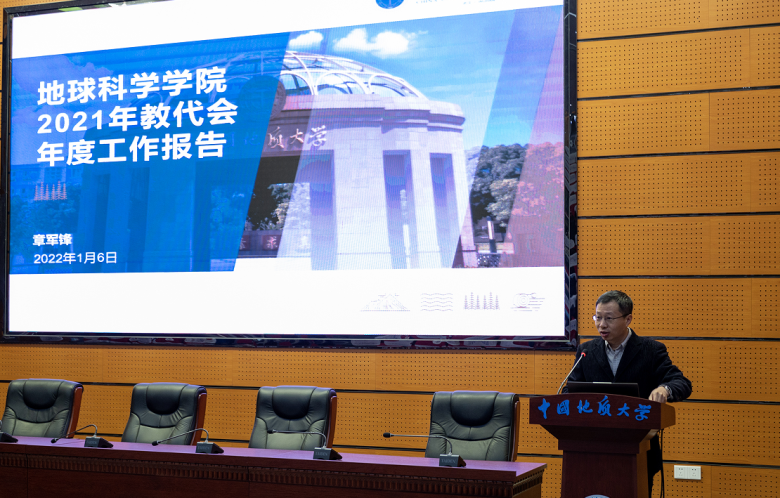 章军锋院长工作报告从几个方面回顾学院2021年的主要工作和成绩,并布置2022年学院重点工作。他说,2021年学院党委坚持以一流党建引领研究型学院高质量发展,通过创新工作路径,扎实推进党史学习教育活动持续发力,认真落实教育部巡视和审计整改措施,注重抓品牌特色,抓班子履职尽责,党建质量取得喜人成效。地球化学系党支部获评湖北省高等学校先进基层党组织,学院党委和地球化学系党支部获湖北省推荐参评全国“双创”建设申报,以党建带团建,1个团支部获评“全国活力团支部”。