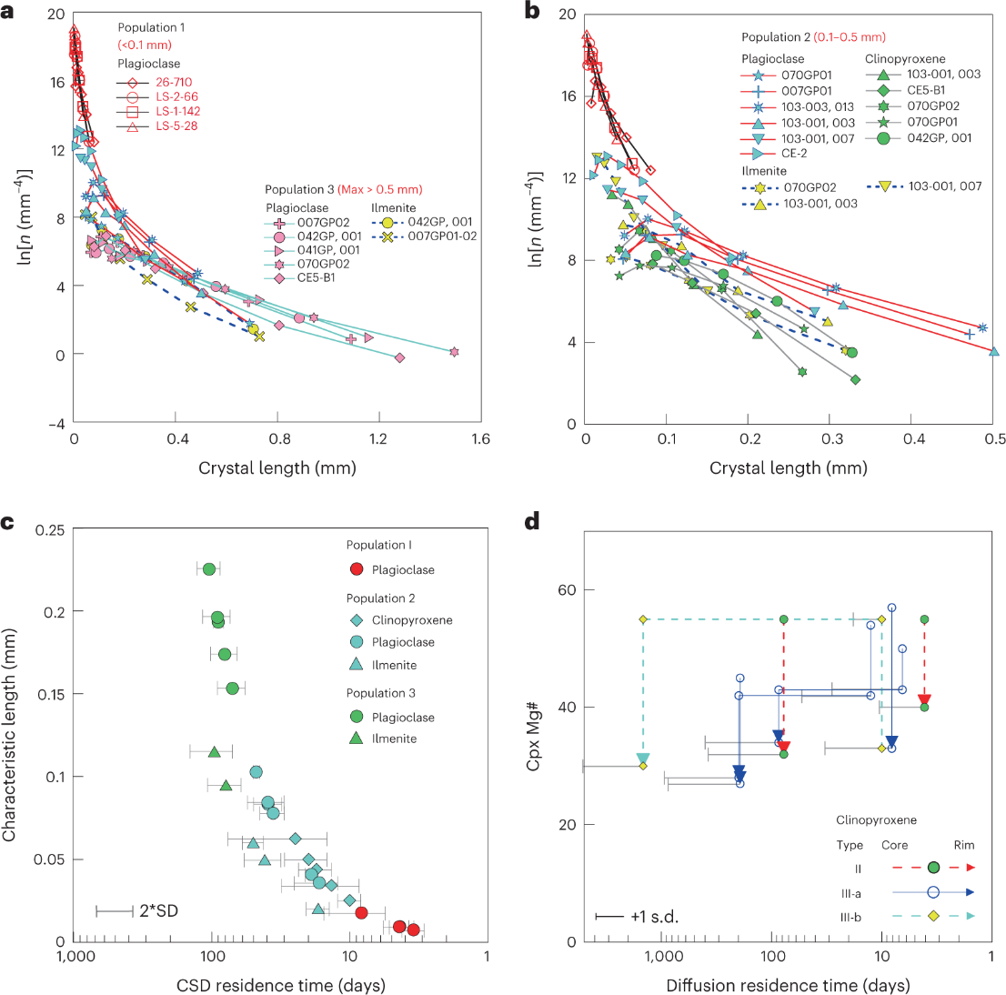 图1:嫦娥五号玄武岩的晶体粒度分布(CSD)和单斜辉石Mg#扩散结果。a, 嫦娥五号玄武岩碎屑中的斜长石、钛铁矿和闪石的CSD模式。b, 微晶群1和群2的CSD模式。c, CSD停留时间(days)与特征长度(mm)。d, 单斜辉石环带Mg#扩散时间