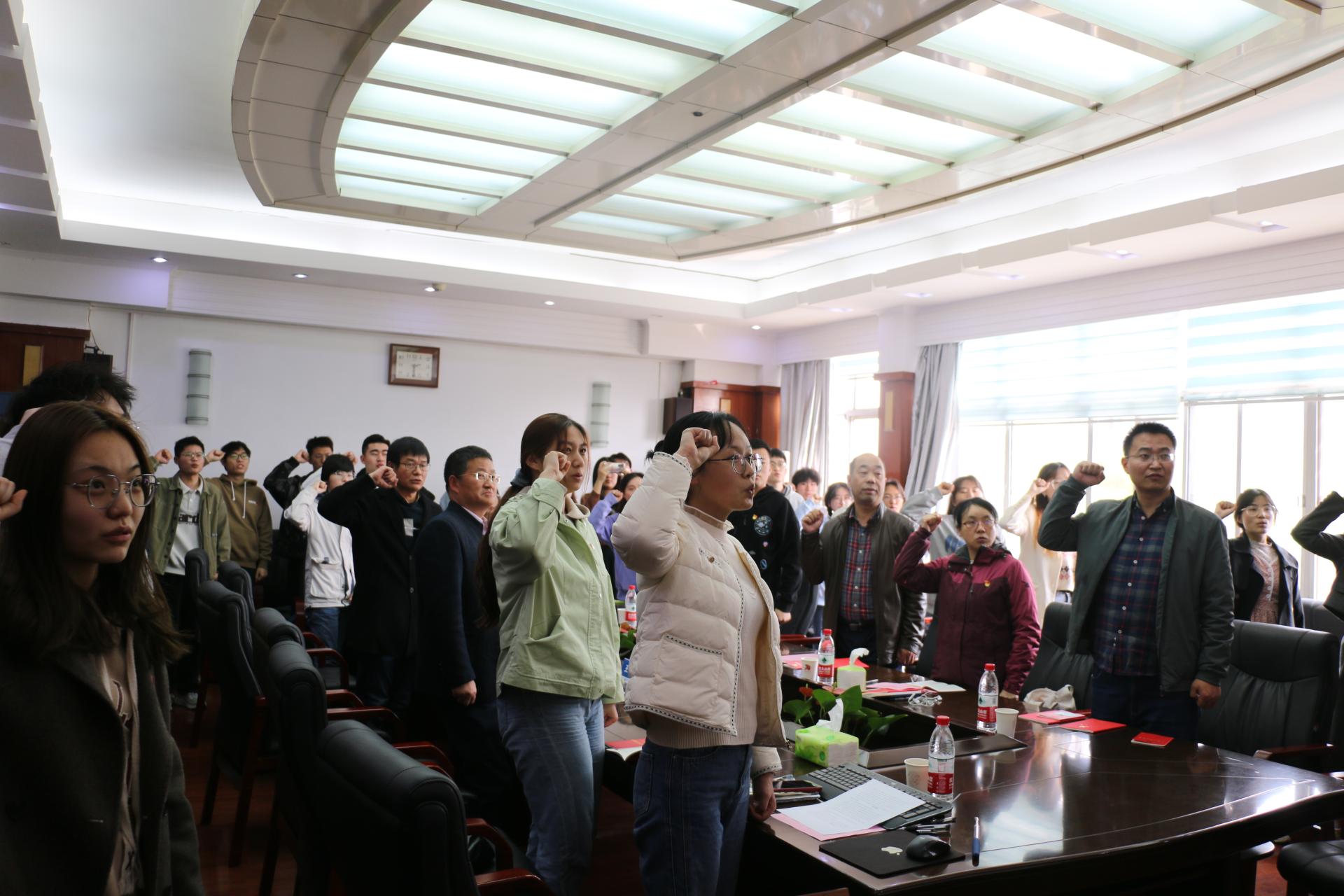 全体与会师生党员重温入党誓词,地球化学系党支部书记谢淑云领学党章。