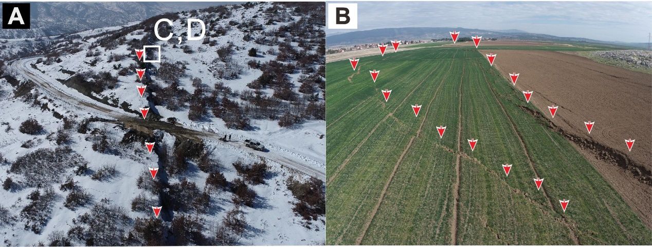 2023年2月16日,土耳其首震发生后第十天,Kusky研究团队将项目组成员博士生孟建南派达震区,与项目组海外合作者成员土耳其中东技术大学地质工程学院院长、中国地质大学(武汉)客座教授Erdin Bozkurt教授共同开展震后地质调查。项目组在地表破裂痕迹被降雨、洪水、灾后重建以及其他震后变形作用破坏之前,对与该次地震事件造成死海断层、东安纳托利亚断层的地表位移进行系统实地测量,并选取代表性区域,对地震导致的地表破裂进行厘米级无人机填图,并以数字地图的形式永久保存。这是人类历史上震后罕见和及时的地表破裂变形原始记录,为大型走滑型地震事件导致的地表变形、破裂在复杂断层系统之间的传播机制提供了重要参考。文章成果于2024年1月19日发表在《Science》期刊,并作为Research Highlight推荐。第一作者为中国地质大学(武汉)泥巴影院 2018级博士生孟建南和Timothy Kusky教授,共同通讯作者为Timothy Kusky教授和美国地质调查局Walter Mooney教授,共同作者还包括土耳其中东技术大学地质工程学院Erdin Bozkurt教授,土耳其哈卡里(Hakkari)大学工程学院Mehmet Nuri Bodur教授和地质过程与矿产资源国家重点实验室王璐教授。