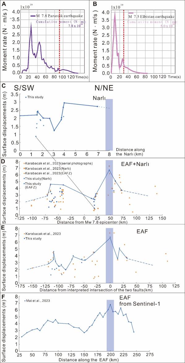 图 2 A和B分别为Mw7.8和Mw7.5地震能量释放谱图;C. 纵轴为NarLı段地表位移值,横轴为数据点到震中的距离;D. 纵轴为NarLı段和EAF地表位移值,横轴为数据点到震中的距离;E. 纵轴为EAF地表位移值,横轴为数据点到震中的距离;F. 纵轴为EAF地表位移值,横轴为为破裂长度, 该数据集来源于已发表的卫星遥感数据。蓝色数据点为野外实测值,黄色数据点为已发表数据,蓝色条带指示地表最大位移的位置,折线展示地表最大位移值的变化趋势。