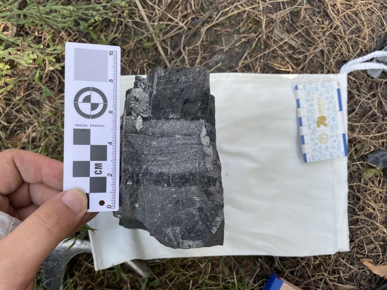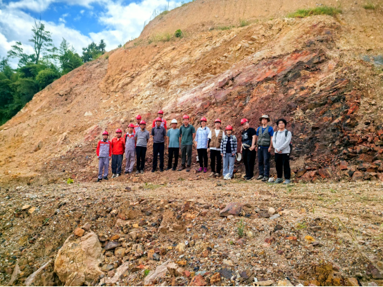 学习完苟坝会议精神后,团队一行前往106地质大队的临时野外工作现场,实地观察铝土矿岩心样品。带队专家及老师详细讲解了铝土矿岩心中典型矿石结构和矿物组成,并指导团队成员学习钻孔岩心的系统编录方法。随后在106地质大队的带领下,前往仙人岩矿区观察铝土矿富矿地层露头及其与周围地层的接触关系,并在铝土矿含矿岩系中发现了保存较好的植物根系化石,这为研究铝土矿形成过程提供了新线索。此外,专家在野外还详细讲解了铝土矿的找矿、选冶、综合利用以及矿区生态修复等关键流程。这些流程与贵州省的“富矿精开”战略紧密相连,旨在通过科学管理和技术创新,提高铝土矿资源的利用效率,同时保护和修复矿区生态环境,确保资源的可持续开发。这些流程的讲解让团队成员对铝土矿的整个生命周期有了全面的了解,特别是“富矿精开”战略的实施,让成员们认识到了科学管理和技术创新在资源开发中的重要性。