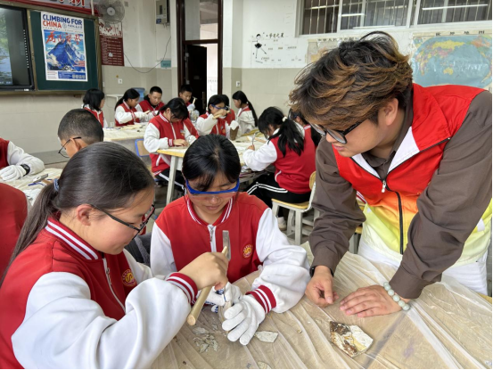本班科普课堂后是DIY串珠手链体验活动,李槟馨在讲台上演示,罗明辉和支教团赵安然老师辅助在各个小组间逐一指导,学生们挑选了喜欢的颜色及矿物珠子原料,按照各自的手腕粗细,完成了自己独一无二的珠宝手链,在学思践悟中感悟珠宝矿物的魅力。