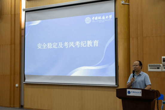 党委副书记、李四光学院常务副院长赵得爱向全体学生作安全稳定和考风考纪专题教育,带领同学们学习学校课程考核违规处理办法,结合典型案例,介绍了考试作弊行为的认定标准与处理办法,为同学们敲响诚信警钟。同时他也结合在学生群体中普遍存在的安全稳定问题,提醒同学们要严守安全底线,不碰纪律红线。