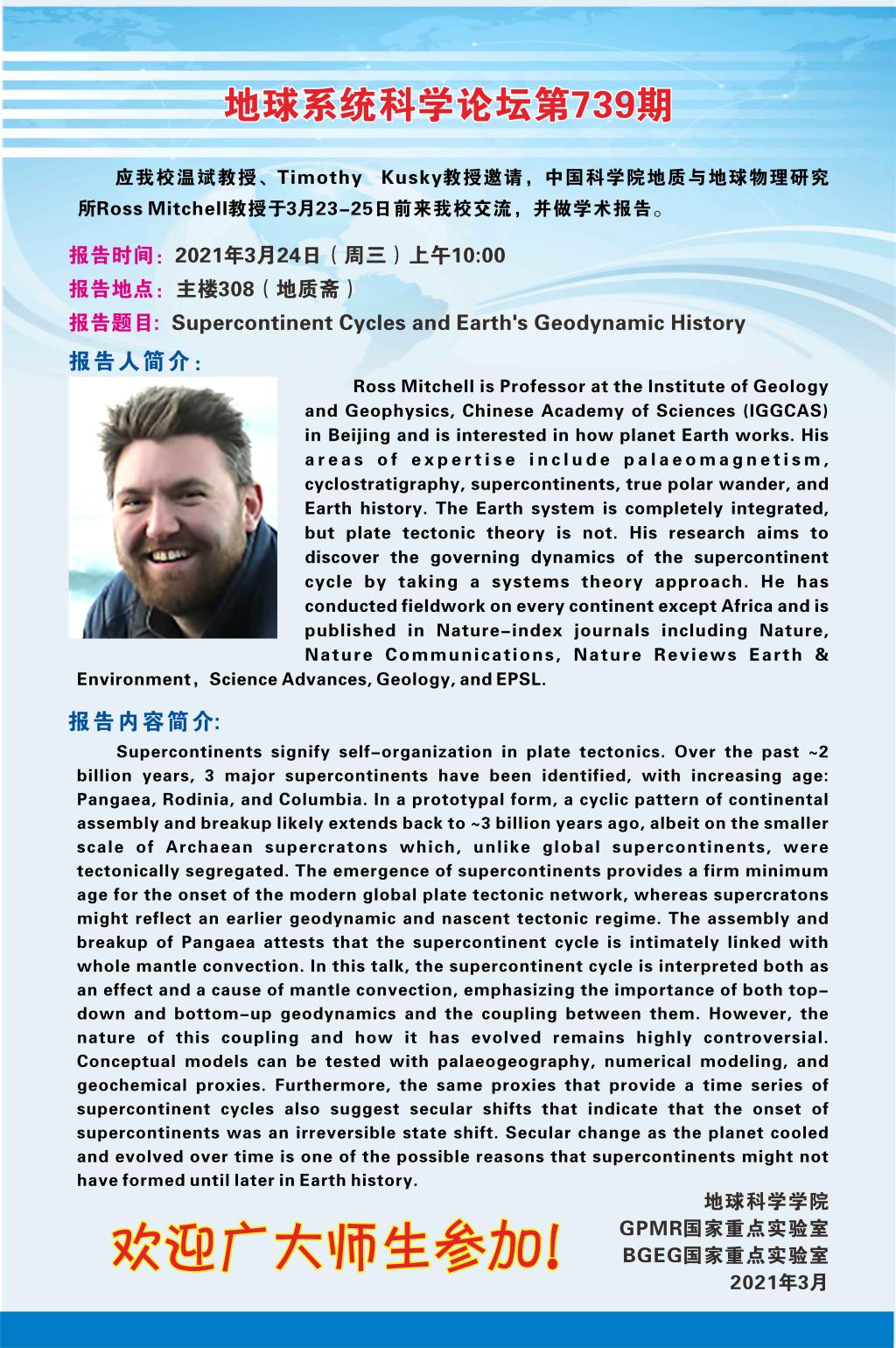 【3月24日】中国科学院地质与地球物理研究所Ross Mitchell教授学术报告