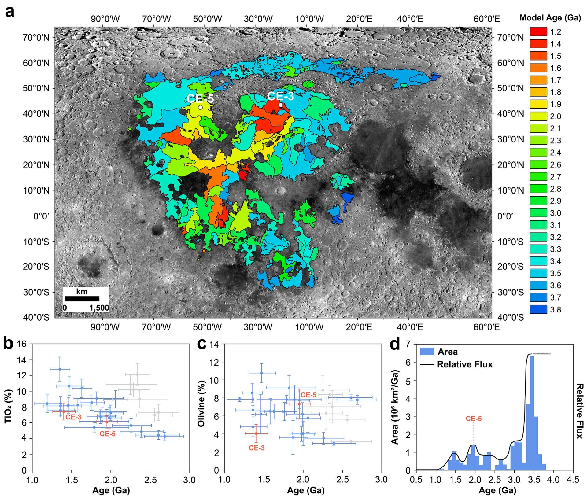 年轻月海玄武岩是月球近期(30亿年以来)火山活动的产物,蕴含月球晚期热演化及月球如何逐步走向死寂的奥秘。我国嫦娥三号对雨海北部的年轻玄武岩单元进行了探测,而嫦娥五号更是直接从风暴洋北部地区采集到了距今20亿年左右形成的玄武岩样品,为我们认识月球晚期火山活动提供了可能。泥巴影院 行星所科研团队基于嫦娥三号和嫦娥五号任务提供的宝贵地面真值,对全月年轻火山活动进行了研究,重新解译了它们的物质组成并校正了各火山单元的年龄。相关成果发表在《自然·天文学》上,第一作者为中国地质大学(武汉)钱煜奇、佘振兵、何琦,通讯作者为肖龙、汪在聪。