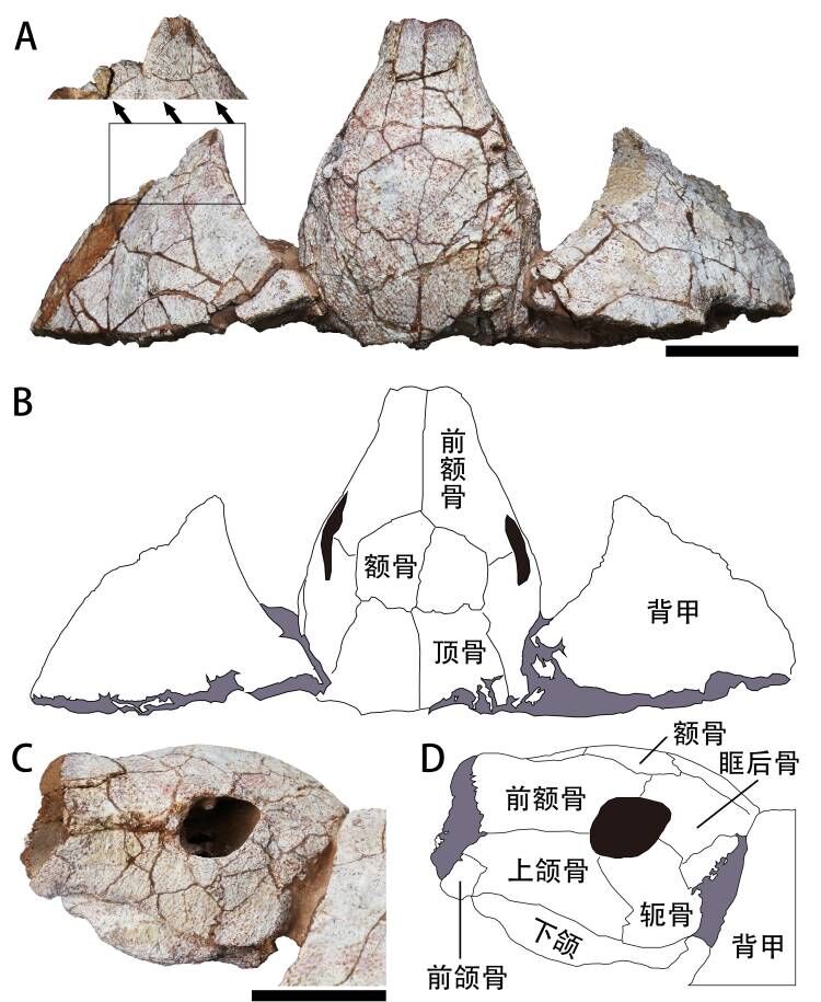 1. 杨氏南雄龟的照片和线条图。其中A-B为背视,C-D为头骨左侧视,比例尺代表5 cm。据Ke(2023)修改。