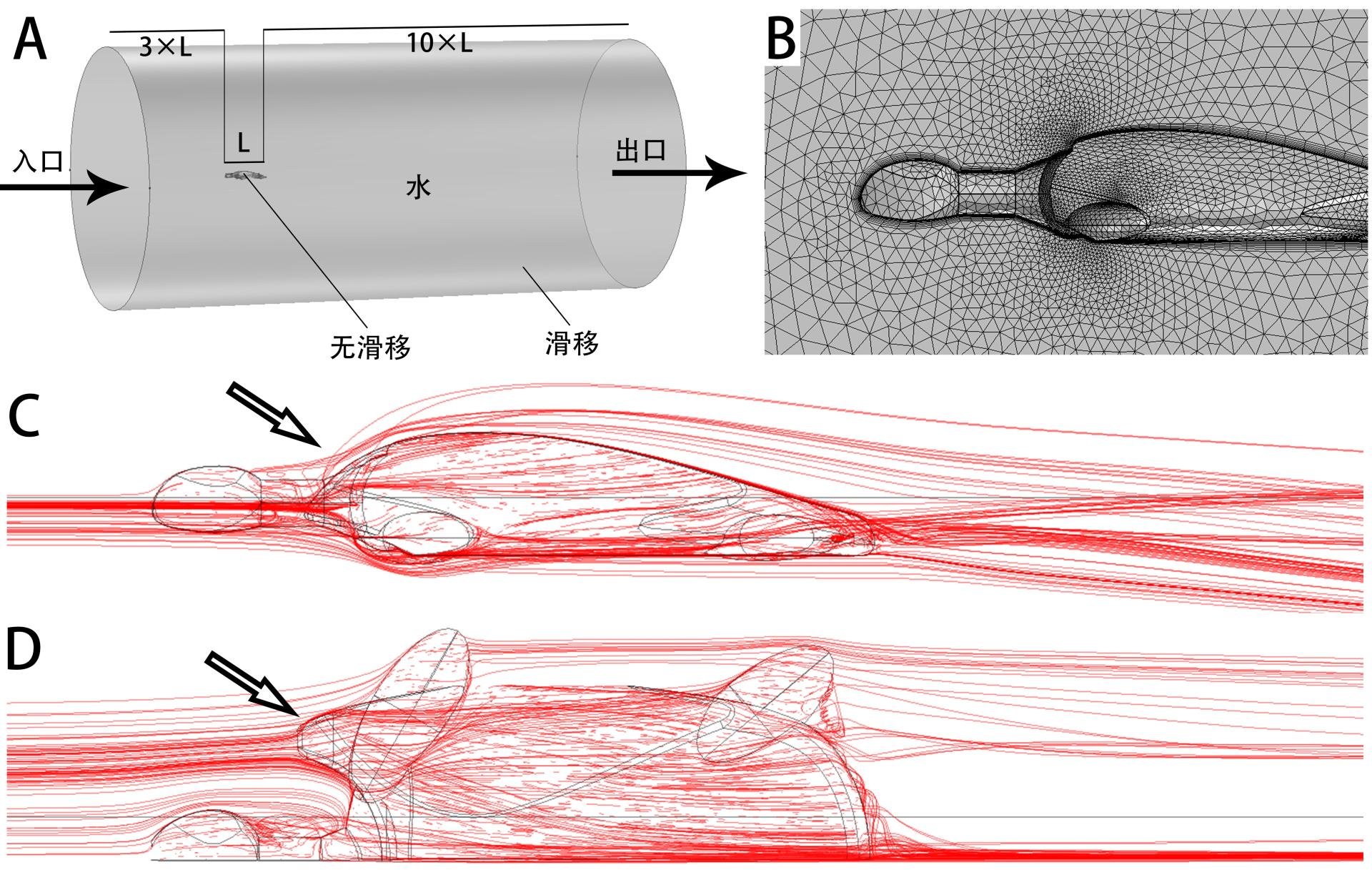 一个有趣的问题是:南雄龟属的背甲前端为什么有一对角状突?类似的结构在现代龟鳖中未曾被发现。科研人员认为角状突具有多种功能,其中最主要的功能是自我保护。南雄龟属成员具有较大的头骨、微弱的颊凹和颞凹,这使它们无法将头缩入壳内。因此,背甲前端的角状突可以在一定程度上为头骨两侧提供保护。此外,南雄盆地在白垩纪拥有极端炎热的气候(平均温度27~34℃),因此南雄龟可能会将身体长期浸没在水中以降低体温,类似于一些现代陆龟。依据这种假设,科研人员针对南雄龟开展了计算流体力学研究(图3 A-B),并模拟其在湍流(k-epsilon模型)中的移动过程。计算流体力学模拟的主要流程包括建立模型和计算域、设置边界条件、网格化处理、计算等。计算结果显示南雄龟的角状突能降低约25%的阻力。这是因为南雄龟的角状突可以使身体前端更加流线化,从而分散来自身体前方的水流(图3 C-D)。