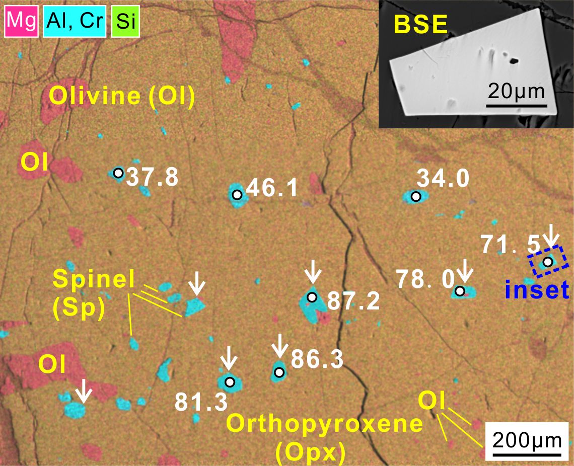 图1 Chagan-Uzun蛇绿岩橄榄岩斜方辉石中的橄榄石残留和尖晶石包裹体(白色箭头指示自形的尖晶石颗粒,数字则代表尖晶石的Cr#)