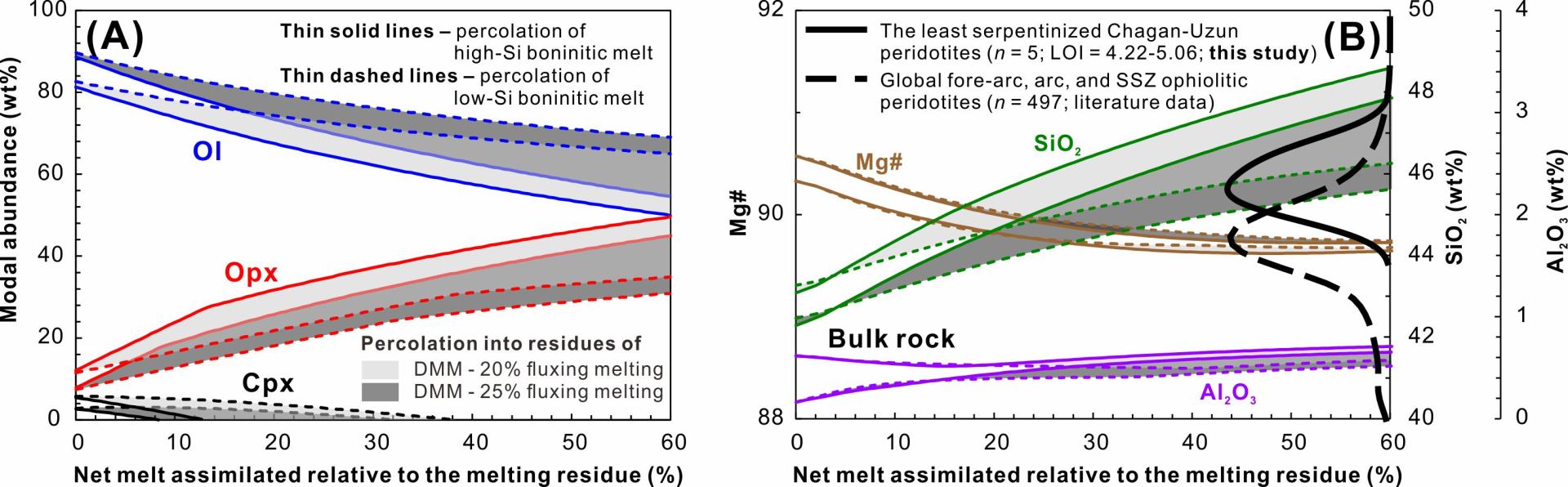 针对上述问题,本研究选取了俄罗斯境内代表岩石圈地幔楔的Chagan-Uzun蛇绿岩橄榄岩为研究对象。详细的岩相学观察发现,这些橄榄岩中斜方辉石普遍包含有残留的不规则状橄榄石,以及自形程度高且与玻安质熔体具有明显亲缘性的尖晶石包裹体(图1)。这些岩相学特征表明地幔橄榄岩在熔融之后经历了玻安质熔体的渗滤作用,即早先形成的橄榄石被部分消耗,同时伴随着斜方辉石(和自形尖晶石)的形成,进而导致被交代橄榄岩SiO2含量的上升(图2)。由于玻安质熔体低Al2O3和高Mg#的特征,被交代橄榄岩的这两个指标通常变化不大(图2B),因此能够保持其原有的亏损特征。这是首次在自然样品中识别出了玻安质熔体渗滤导致地幔楔硅富集的直接矿物岩石学证据。对全球地幔楔橄榄岩数据的分析以及热力学模拟进一步揭示了这一过程的普遍性,表明玻安质熔体渗滤在地幔楔成分和结构的演化中扮演着重要的角色。考虑到地质历史时期中可能出现由增生造山作用引起的地幔楔侧向加积,本研究有可能为大陆岩石圈的形成和演化提供新的视角。