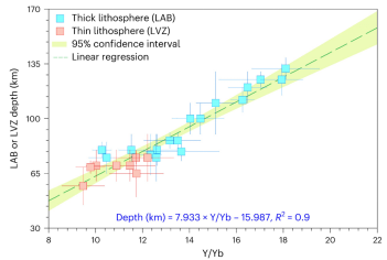 1. 全球大陆/大洋年轻火山岩地区玄武岩Y/Yb比值与岩石圈-软流圈边界(lithosphere-asthenosphere boundary, LAB)或地震低速带(low-velocity zone, LVZ)深度之间的相关性6.