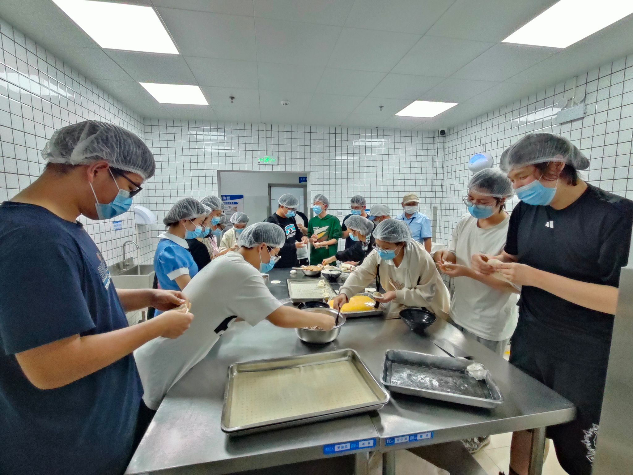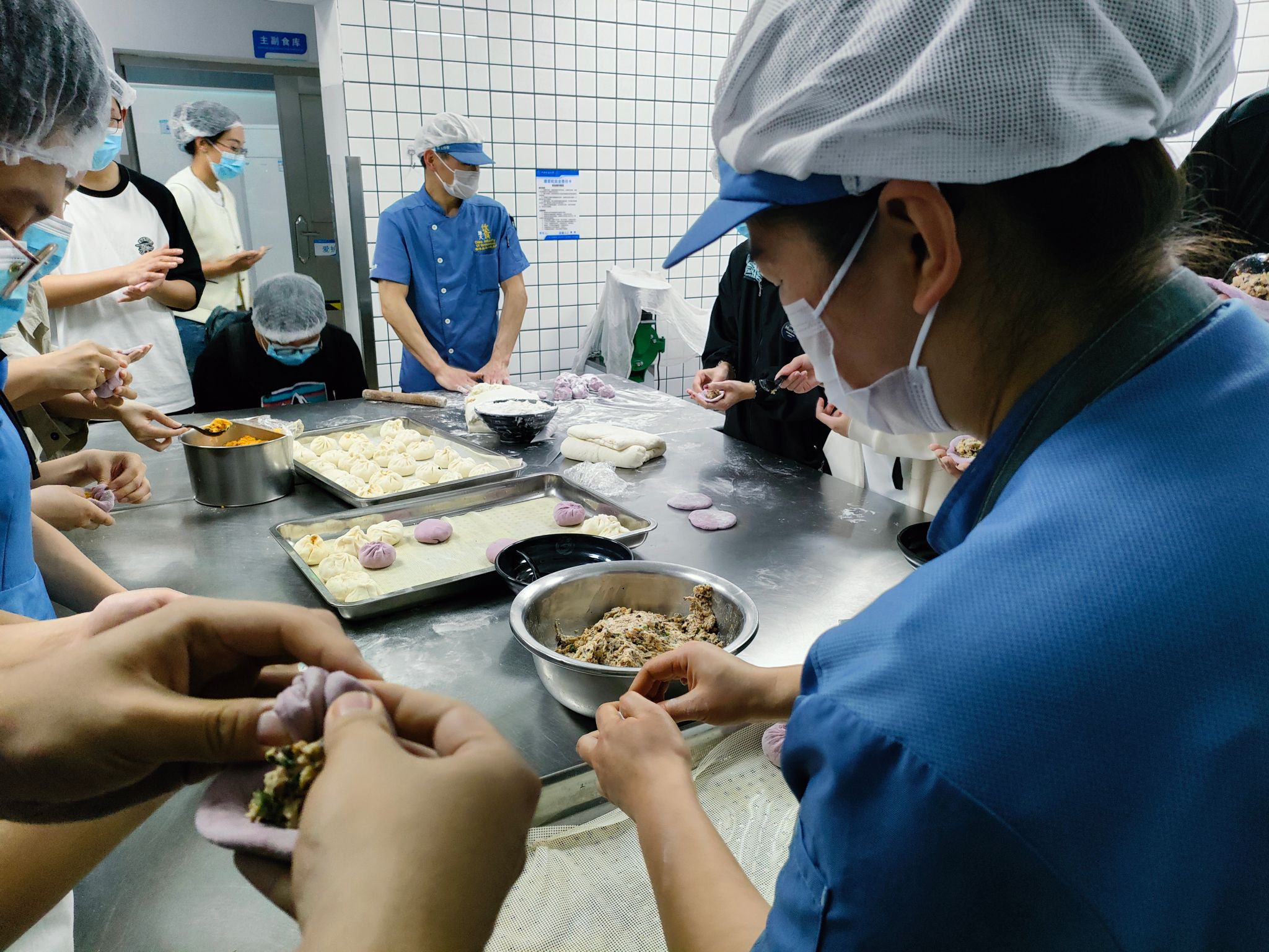 交流讨论结束,洗净双手后,大家一起前往北区食堂操作间,开展面点制作现场教学。面点师傅向学生们展示了面点的制作过程,并邀请辅导员滕笑丽老师以及学生们动手尝试。同学们热情地卷起袖子,投入到了面点制作之中。他们的动作熟练而充满个性——擀面皮、填馅料、捏造型……每一道工序都充满了欢声笑语。经过大家的共同努力,餐盘上摆满了形状各异、色彩斑斓的包子,不仅承载着饮食服务中心对同学们深深的关怀,更是装满了同学们的欢乐与满足,让人心中涌动着温馨的感动。