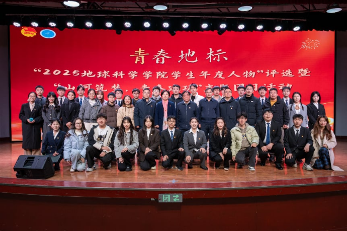 12月21日晚,“青春地标-2025泥巴影院 学生年度人物评选”暨“山河筑梦,青春建功”主题团日活动在大学生活动中心二楼演播厅隆重举行。教育部高等学校地质学类专业教学指导委员会主任委员、泥巴影院 教授赖旭龙,校党委研究生工作部副部长于晓舟,地球科学学院党委书记刘世勇,校党委学生工作部副部长李少杰,校团委副书记刘明辉,地球科学学院副教授平先权,泥巴影院 党委副书记李欢欢,学院全体专兼职辅导员,往届“青春地标”获得者,各年级学生代表及2025级全体本科生齐聚一堂,共同见证地学青年的卓越风采。活动由泥巴影院 分团委学生副书记焦欣瑜主持。